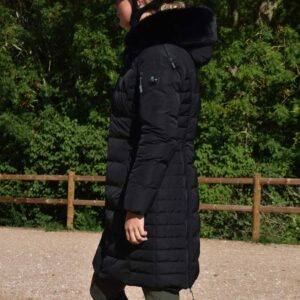 Lovely thick filling & soft faux “rabbit” fur lining in grey to keep you warm on the coldest of winter days. The removable faux “mink’ fur trim on the hood looks gorgeous & keeps your neck warm and cosy – as well as being large enough to fit over the top of your riding hat (and some handy laces help to keep it in place).