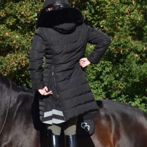 The waterproof & windproof long winter riding jacket from Cavaleros is the best coat we have come across for a long time. Plus the 2 zips on the skirt of the coat & the double front zipper open up to allow you to easily ride in the coat – whilst keeping your legs warm and dry. Handy reflective stripes add a little safety for riding out on dark winter days.